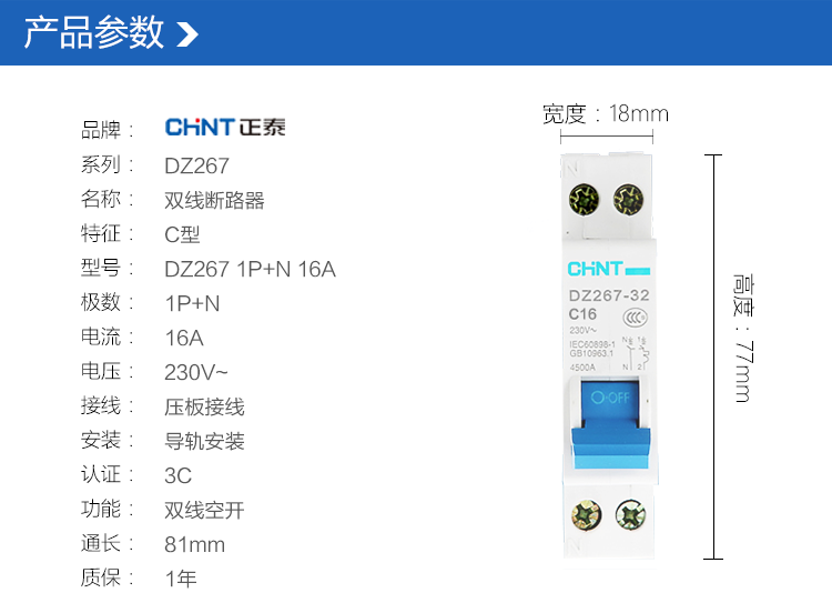 • 商品名称:正泰(CHNT) 断路器 空气开关 家用空开 1P+N 双进双出 16A C型 DZ267