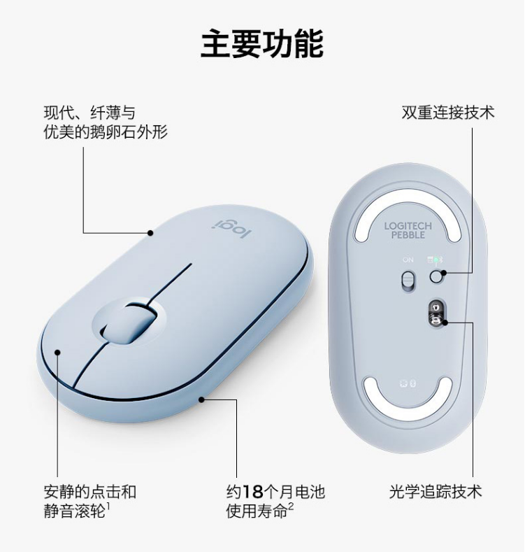 • 商品名称:罗技(Logitech)Pebble鹅卵石 鼠标 无线蓝牙鼠标 办公鼠标 静音鼠标 女性鼠标 便携鼠标 对称鼠标 薄荷绿
